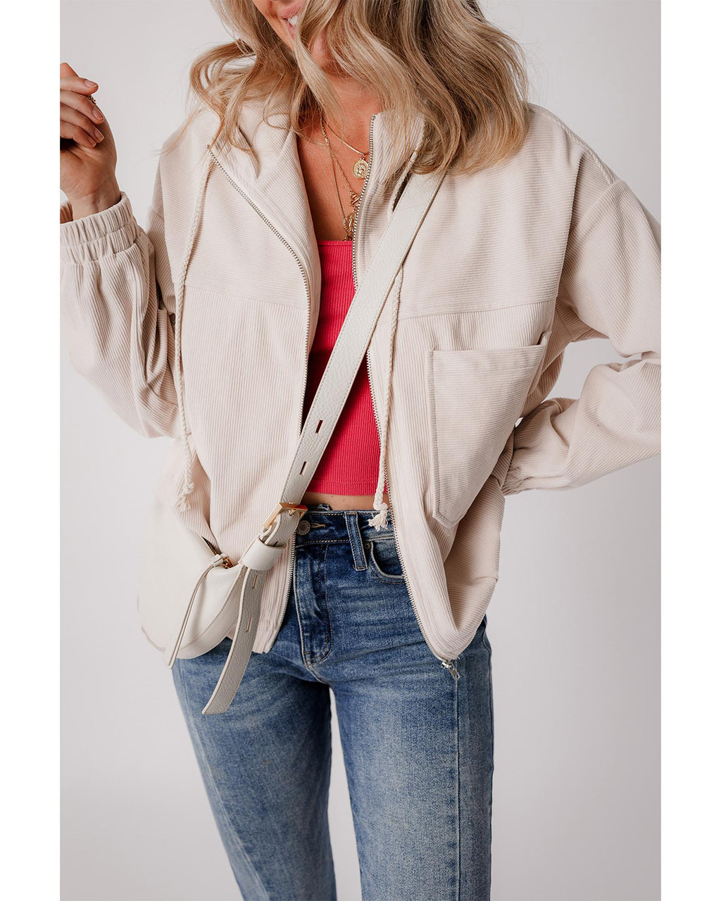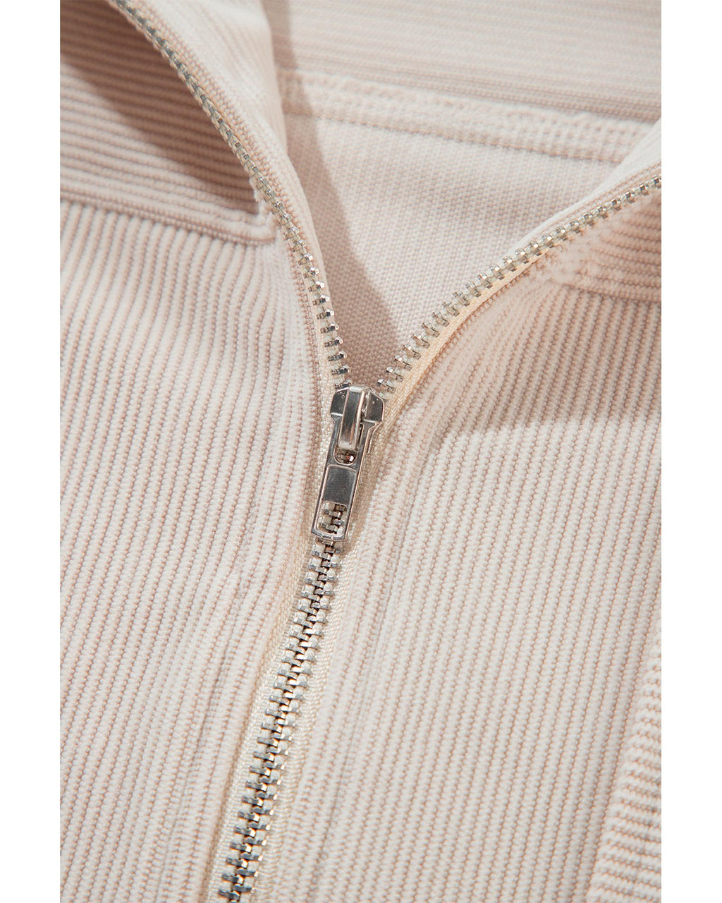 White Corduroy Drawstring Hooded Pocket Zip Up Jacket - M