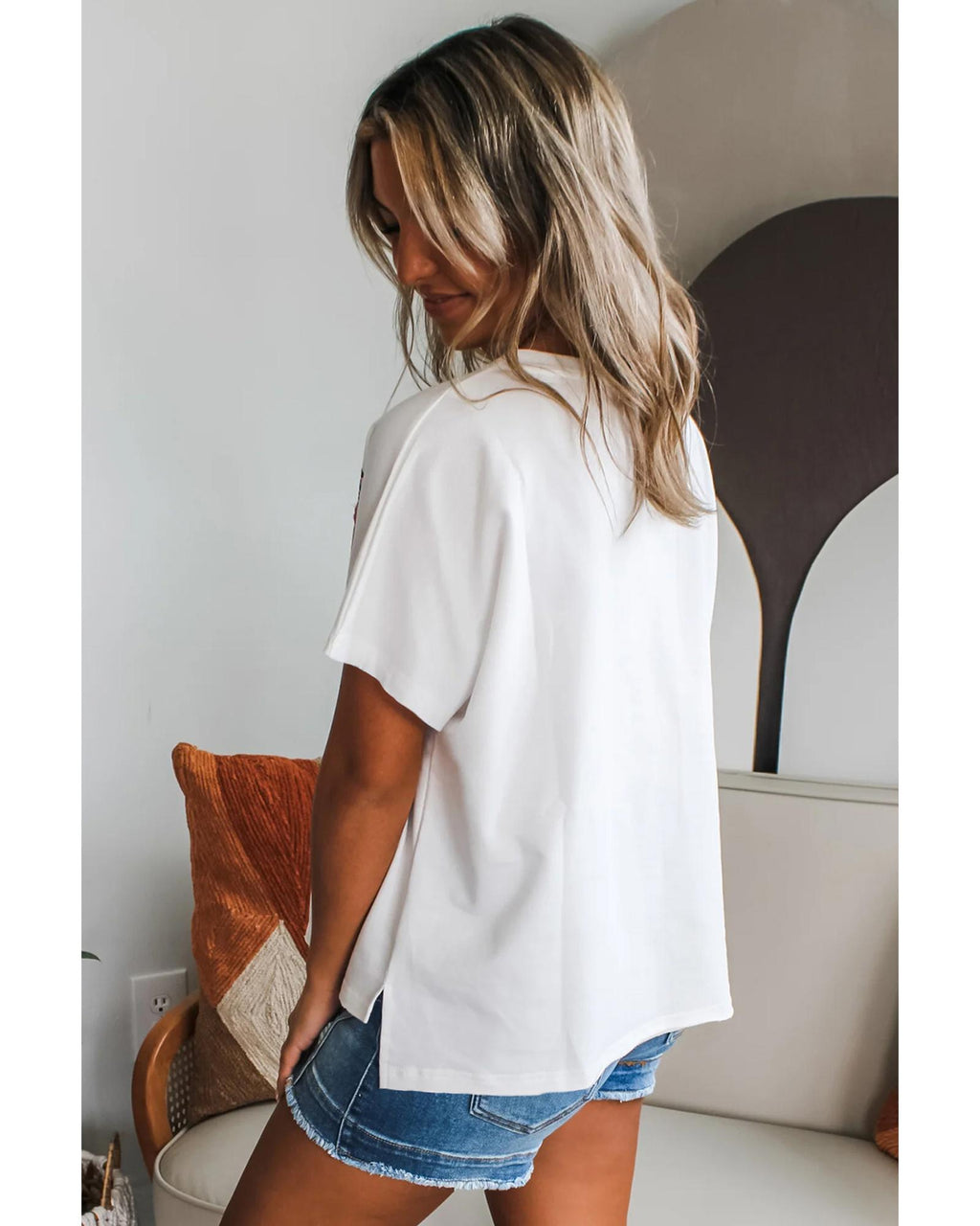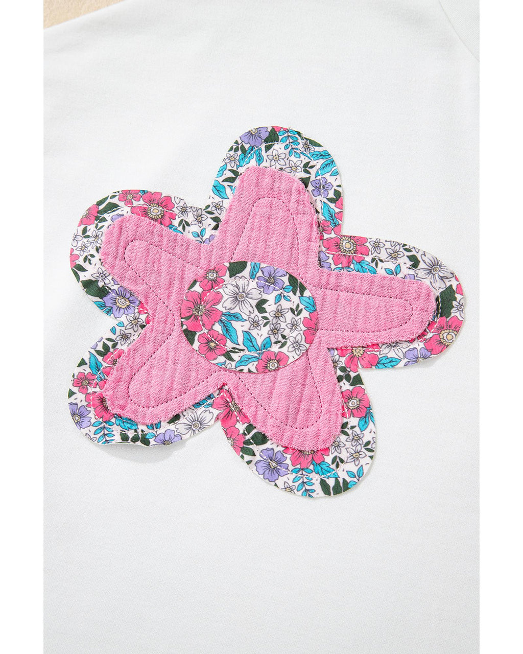 White Floral Applique Notched V Neck Dolman Sleeve Top - L