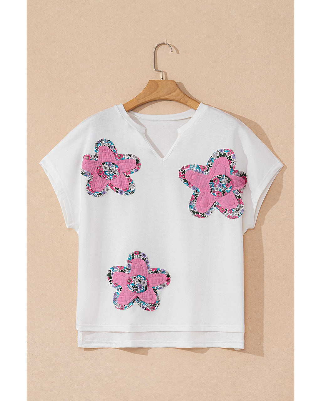 White Floral Applique Notched V Neck Dolman Sleeve Top - S