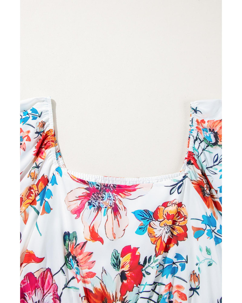 White Floral Square Neck Puff Sleeve Flowy Plus Size Midi Dress - 3X