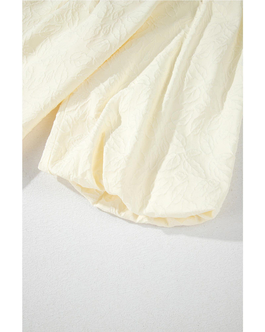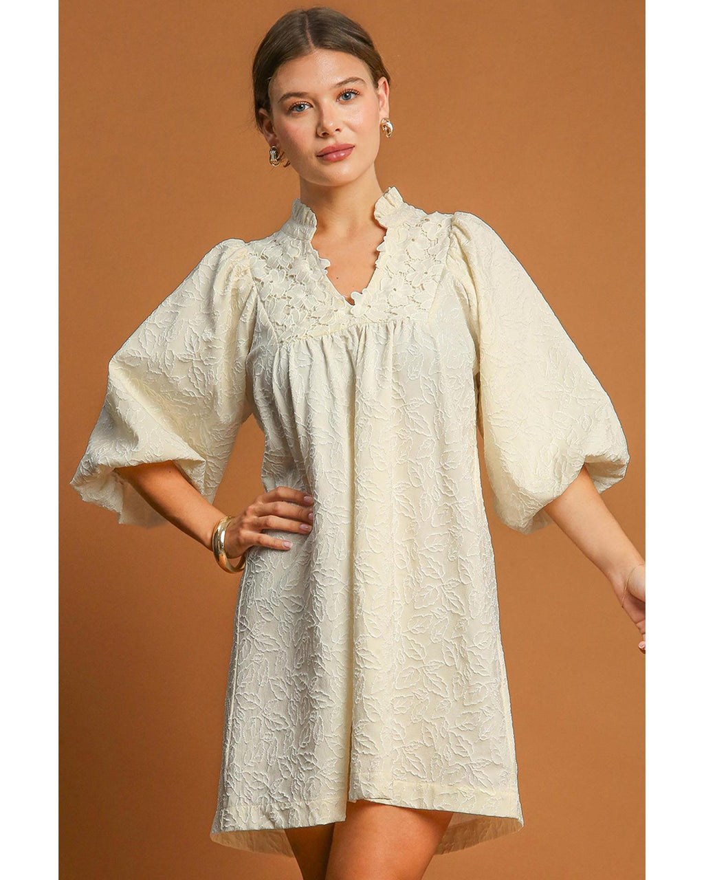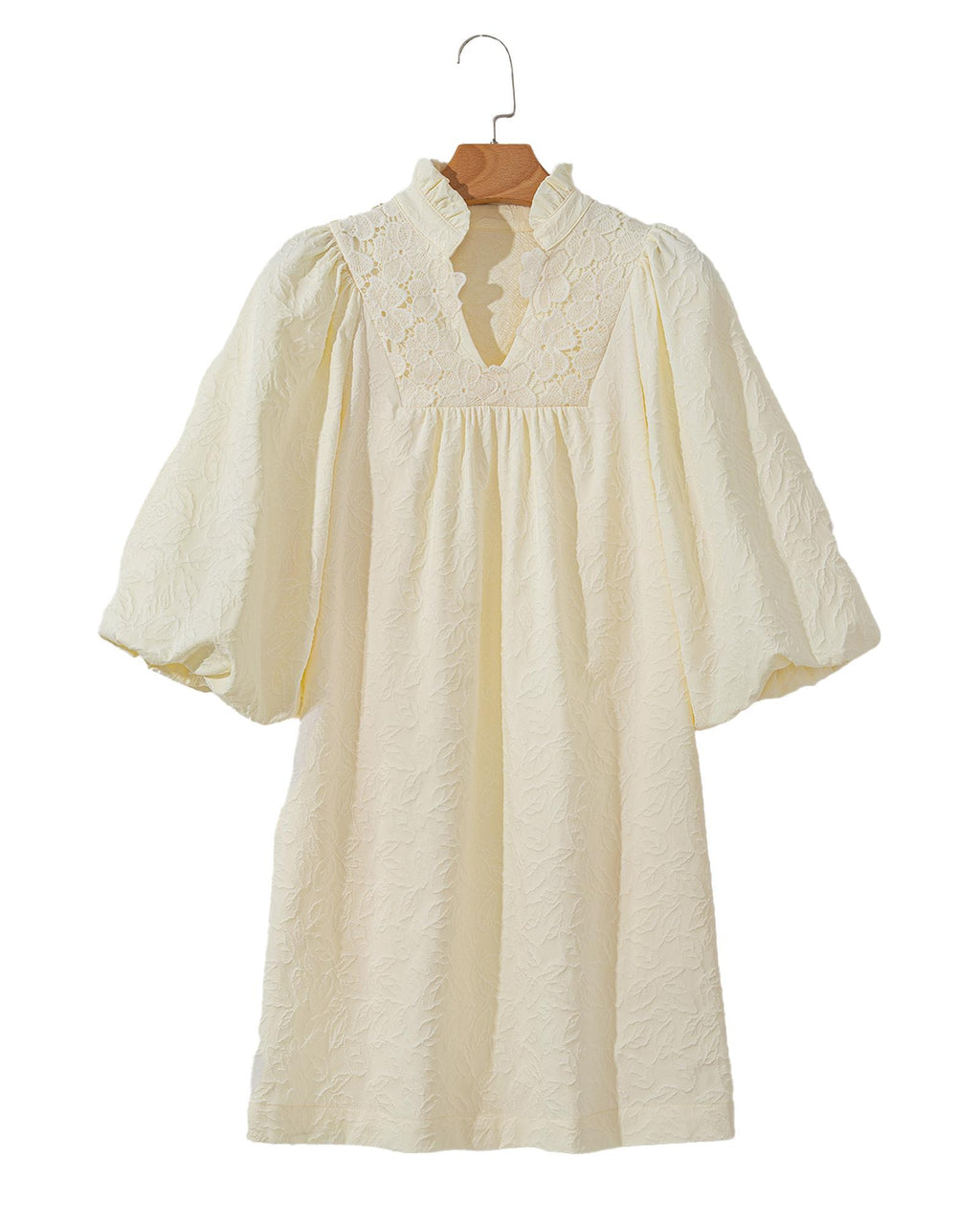 White Floral Textured Bubble Sleeve Frilled Notched Neck Dress - XL