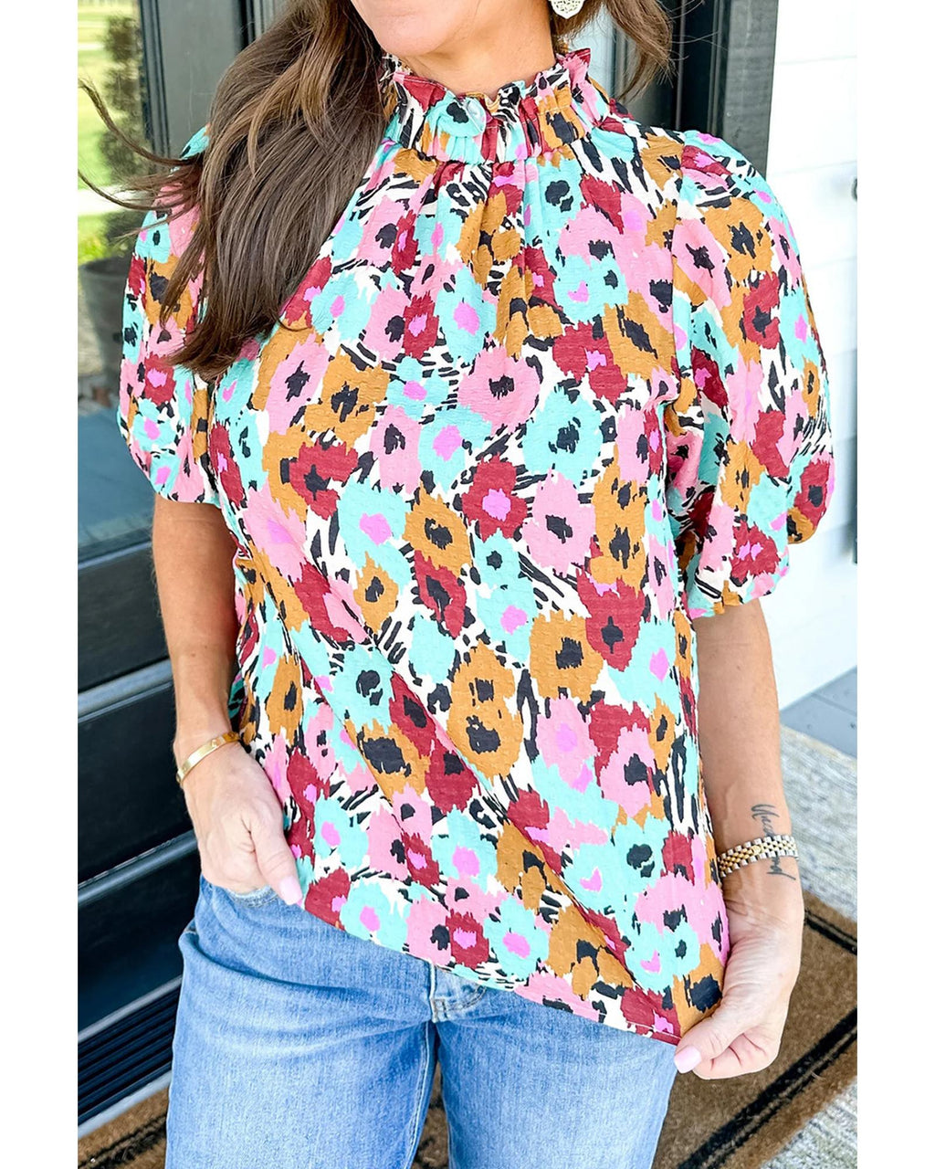 White Frilled High Neck Buttons Back Floral Blouse - M