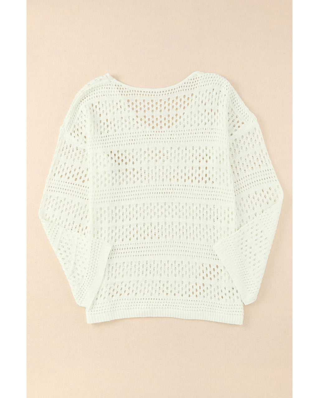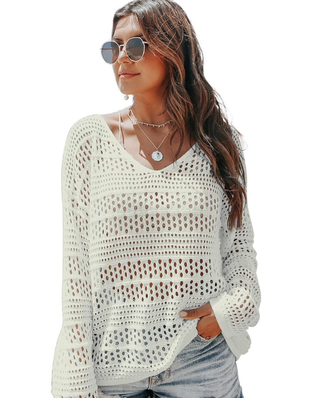 White Hollow Out Crochet V Neck Pullover Sweater - L