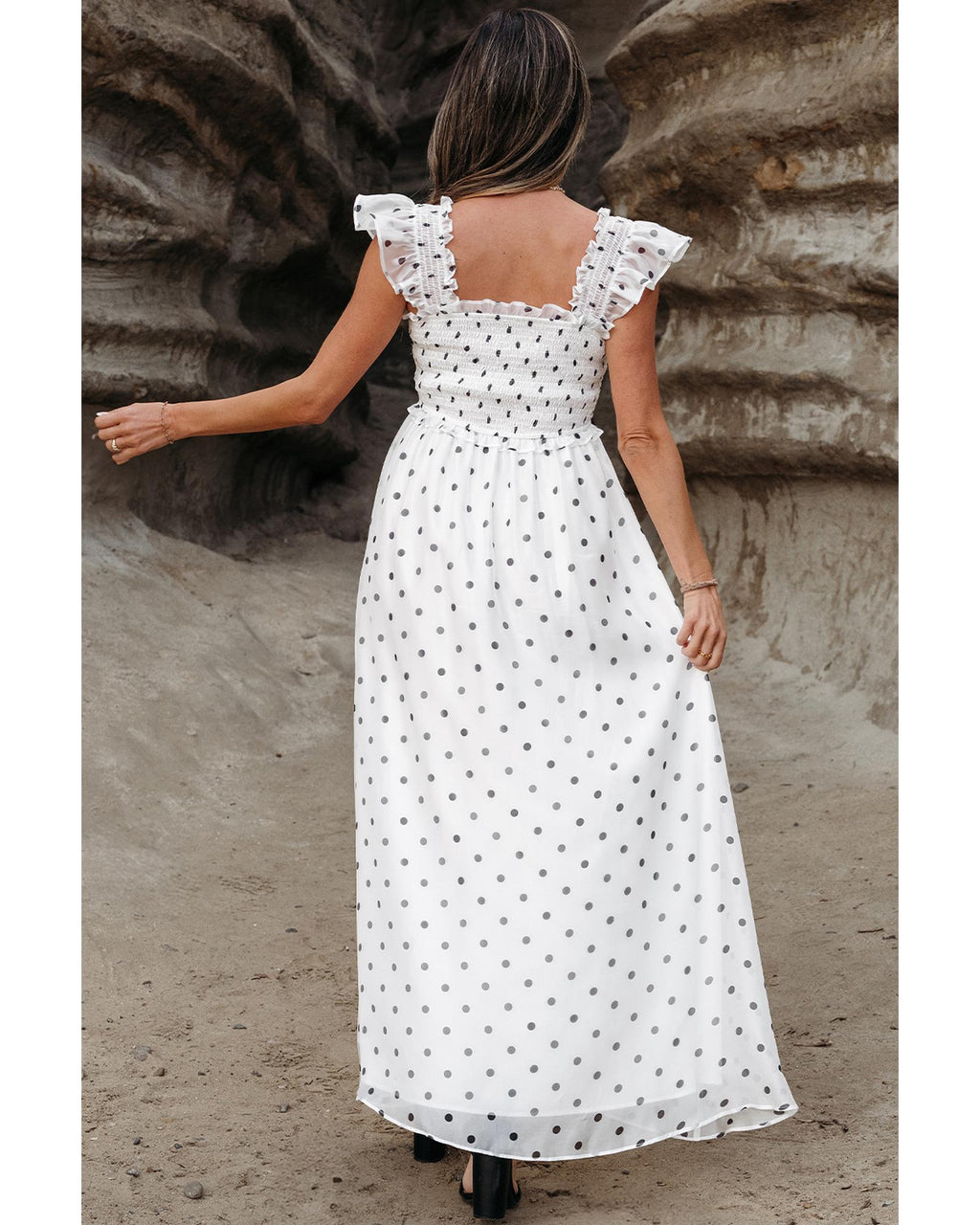 White Polka Dot Flutter Sleeve Square Neck Smocked Maxi Dress - XL