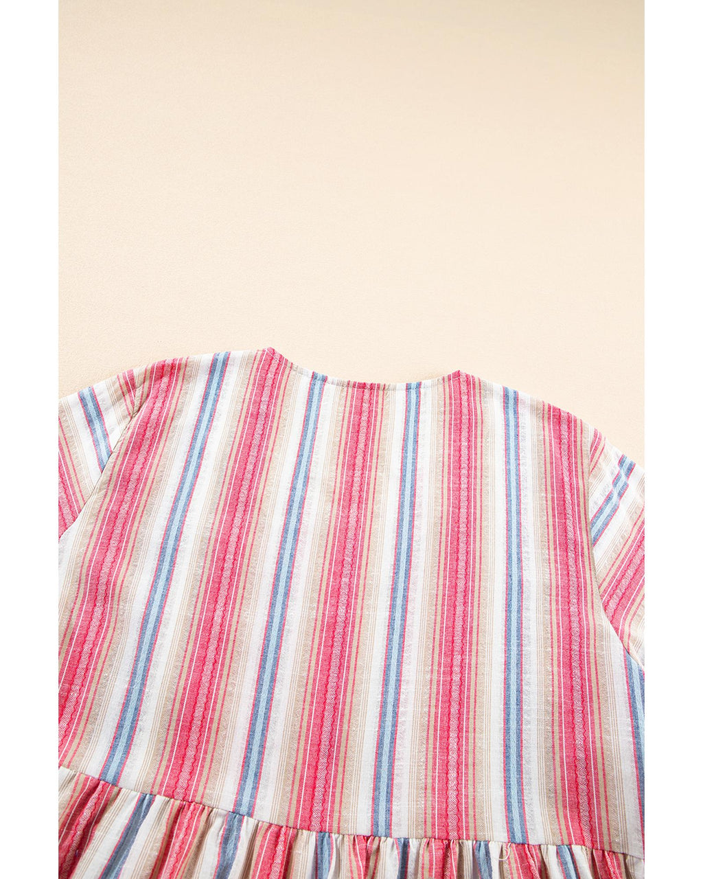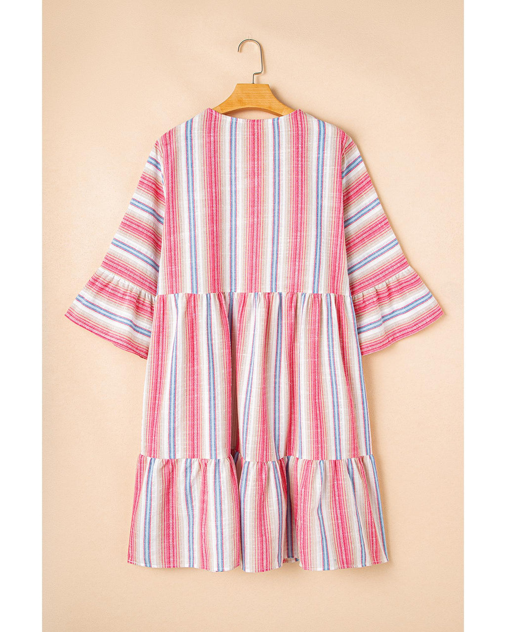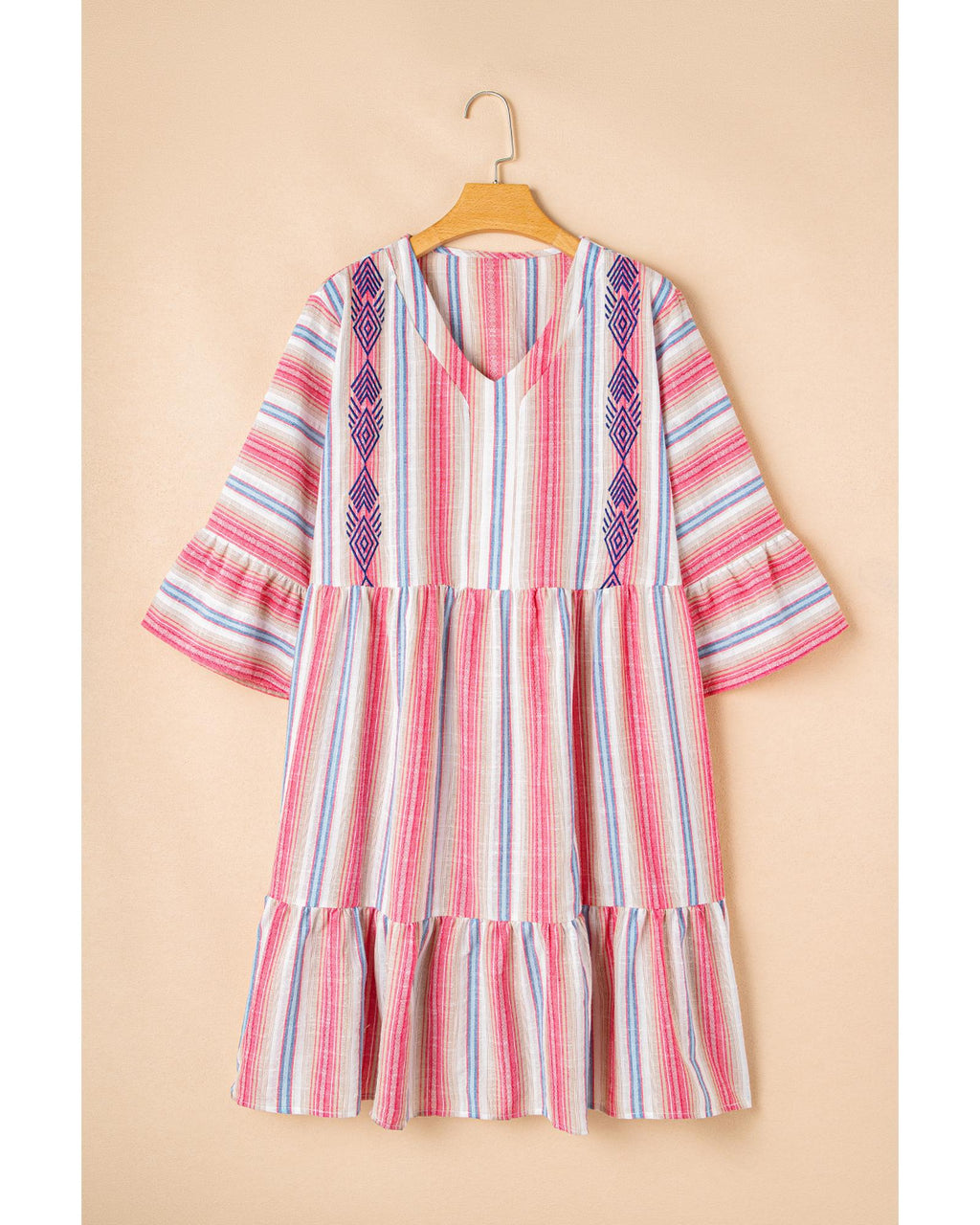 • White Stripe Plus Size Embroidered Detail Flared 3/4 Sleeve V Neck Dress