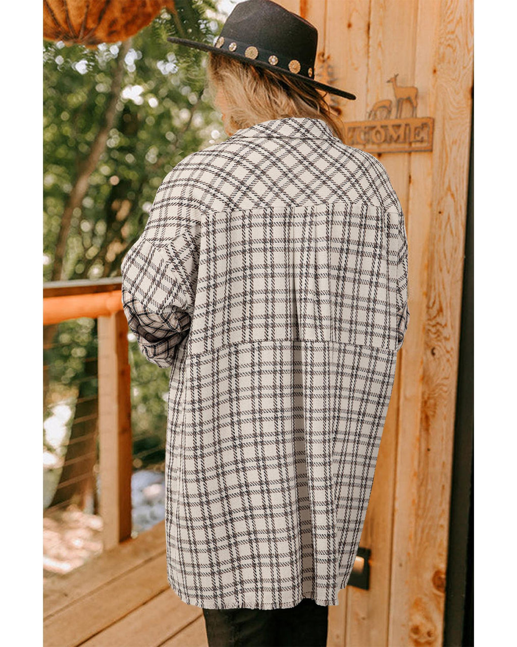 White Stripe Plus Size Plaid Buttoned Raw Hem Tunic Shirt Dress - 2X