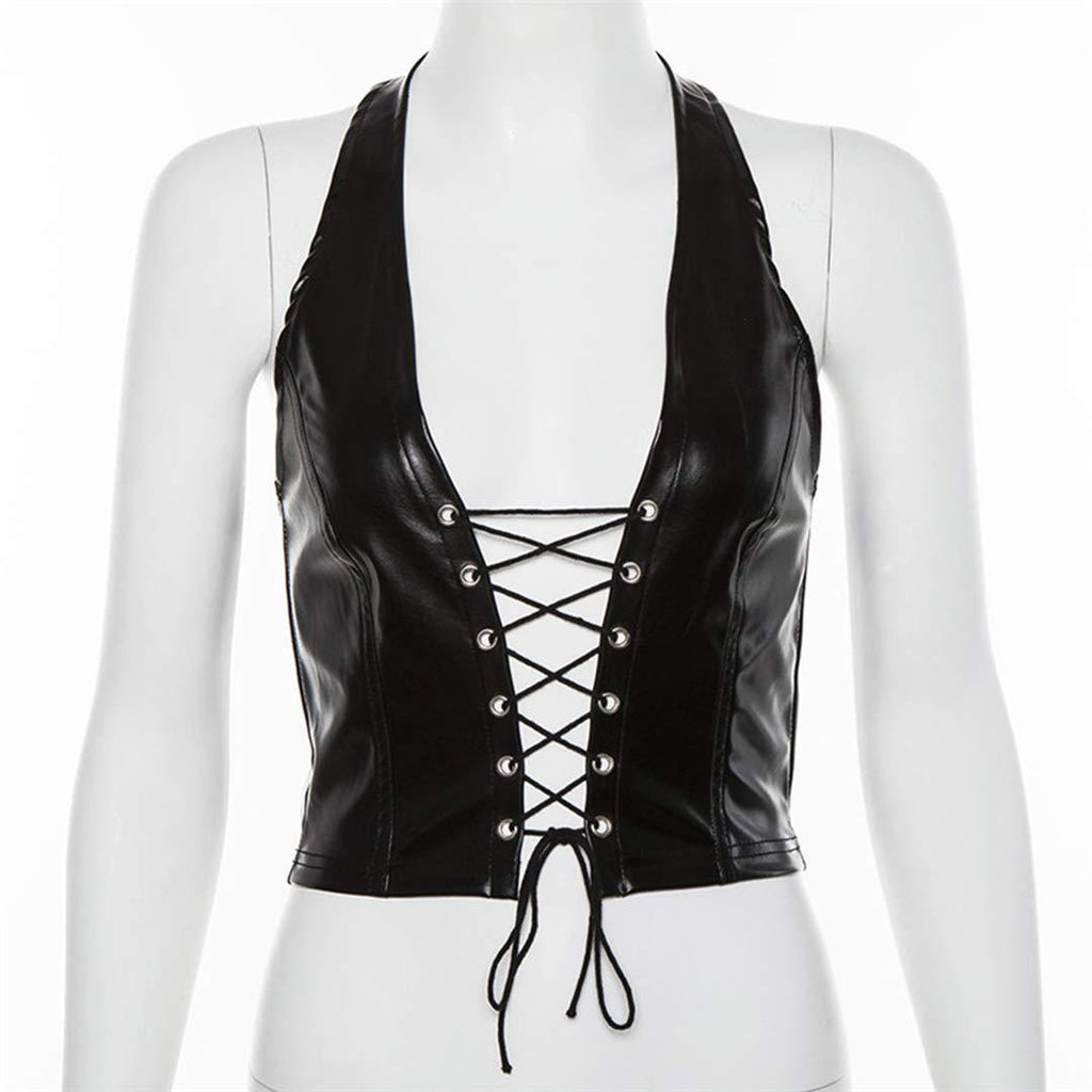 Women's Faux Leather Halter Crop Top Sexy Lace Up Deep V Camisole Gothic Punk Rave Festival Clubwear (Black, Size XL)