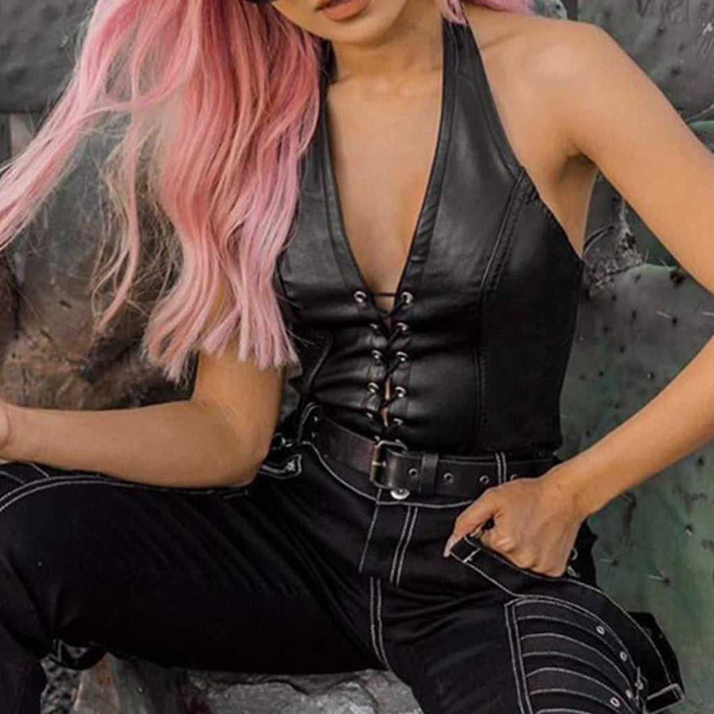Make a bold statement at your next event with this Women's Faux Leather Halter Crop Top. Designed for those who love to stand out, this edgy camisole features a daring deep V-neckline with a lace-up front, blending gothic aesthetics with modern street style. It is the perfect top for music festivals, club nights, or adding a touch of attitude to your weekend outfit in Australia.