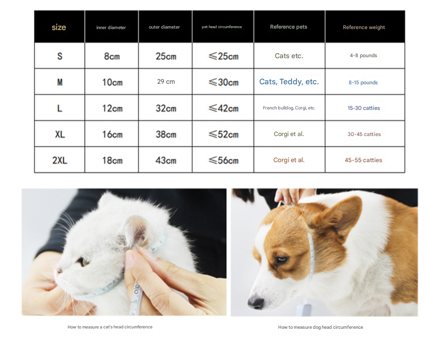 To ensure the best fit and effectiveness, please carefully measure your pet's head circumference (around the widest part of the head in front of the ears) and compare it to the (Pet Head Circumference) in our sizing chart. Also, consider the inner and outer diameter for appropriate coverage. If your pet is between sizes, it's often better to choose the slightly larger size for comfort, ensuring it's still snug enough not to slip off.